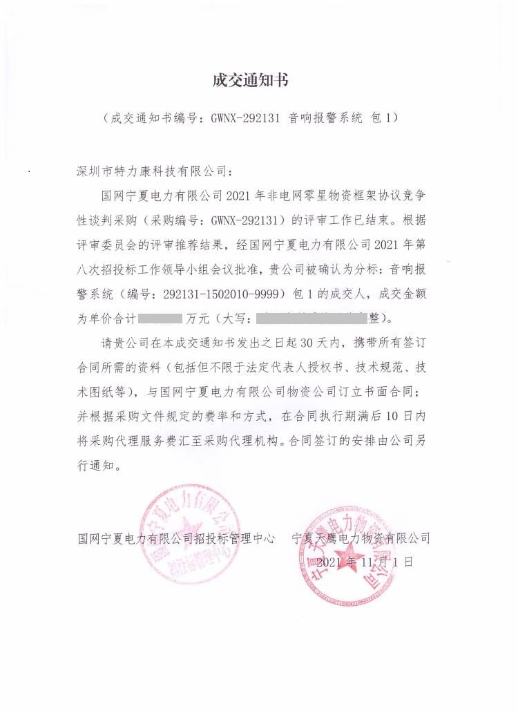 国网宁夏电力有限公司2021年非电网零星物资框架协议竞争性谈判采购(采购编号: GWNX- 292131)的评审工作已结束。根据评审委员会的评审推荐结果,经国网宁夏电力有限公司2021年第八次招投标工作领导小组会议批准,我司被确认为分标:音响报警系统(编号: 292131-1502010-9999)包1的成交人,成交通知如下: